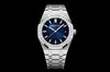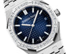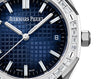 Dial: Smoked blue dial with “Grande Tapisserie” pattern, baguette-cut diamond hour-markers, white gold Royal Oak hands with luminescent coating.