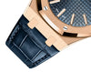 Bracelet: Blue alligator strap with 18K Rose Gold AP folding clasp.