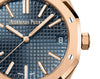 Dial: “Bleu nuit nuage 50” dial with “Grande Tapisserie” pattern, pink gold applied hour-markers and Royal Oak hands with luminescent coating.