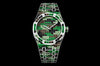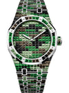 Dial: Dial set with baguette-cut graded black sapphires, tsavorites and smoky quartz, white gold Royal Oak hands with luminescent coating.