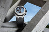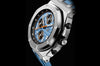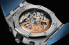 Bracelet: Blue rubber strap with textile decoration with Stainless Steel AP pin buckle and interchangeable strap system. Additional black calfskin strap.