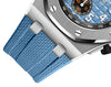 Dial: Blue dial with “Méga Tapisserie” pattern, black counters, arabic numerals hour-markers and white gold Royal Oak hands with luminescent coating, black inner bezel.