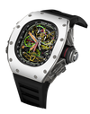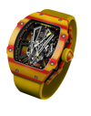 Equipped with a 70-hour power reserve visible at 5 o’clock thanks to an indicator powered by a planetary differential, this manual winding tourbillon calibre sports a baseplate and bridges in grade 5 titanium. The extreme rigidity of titanium enables the calibre to withstand the roughest of trails with ease. Nods to the realm of cycling abound, from the titanium Allen screws that fix the bridges, to the barrel ratchet, which recalls the design of forged wheel spokes, not to mention the tourbillon carriage and the dynamometric crown, which evokes a bicycle pedal. The creation of any timepiece demands a fine balance between total volume, the physical requirements of the movement and its specific features. But user comfort is equally essential, and this was at the heart of the original tonneau shape developed by Richard Mille during the brand’s infancy.