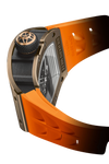 The orange to red and blue to black gradients were made by superimposing layers and increasing the number of firings at 850 °C. In the helmet, two white gold elements containing a black sapphire and two diamonds evoke the floodlights that light up our immediate surroundings. Against the skin, we feel the spacesuit composed of grade 5 titanium, painted white using an airbrush. Other innovations complete this cosmic timepiece. The brown Cermet combines the lightness of titanium with the hardness of a ceramic. The caseband is made of Carbon TPT®, well known in the field of aerospace. The crown is based on the design of a rocket capsule. Even the rubber surrounding it sports the distinctive profile of a Martian rover tyre. Top view Right view Back view Left view.
