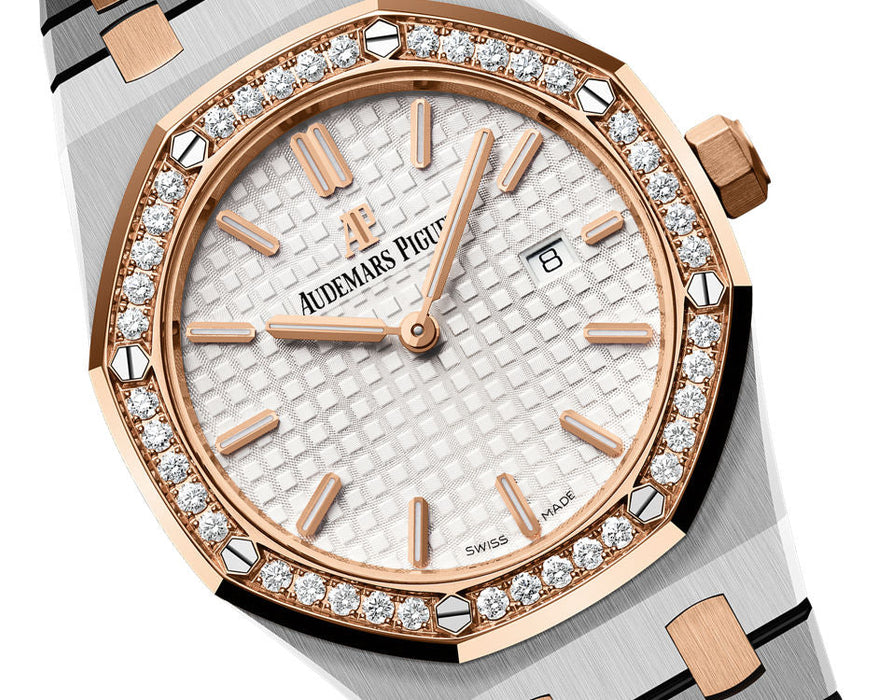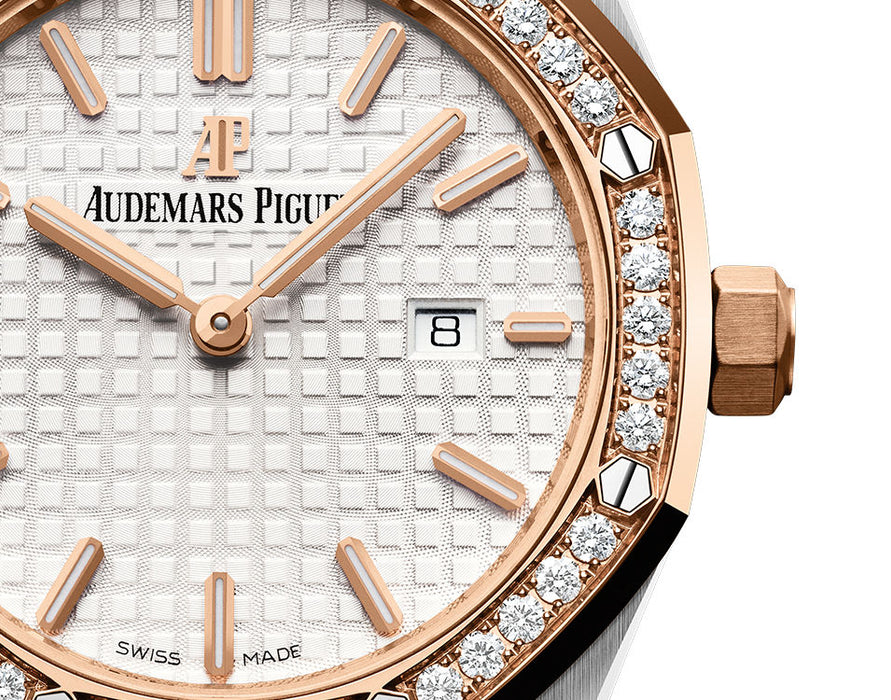 Dial: Silver-toned dial with “Grande Tapisserie” pattern, pink gold applied hourmarkers and Royal Oak hands with luminescent coating.