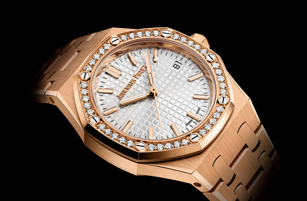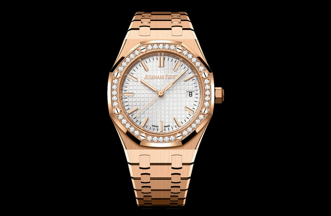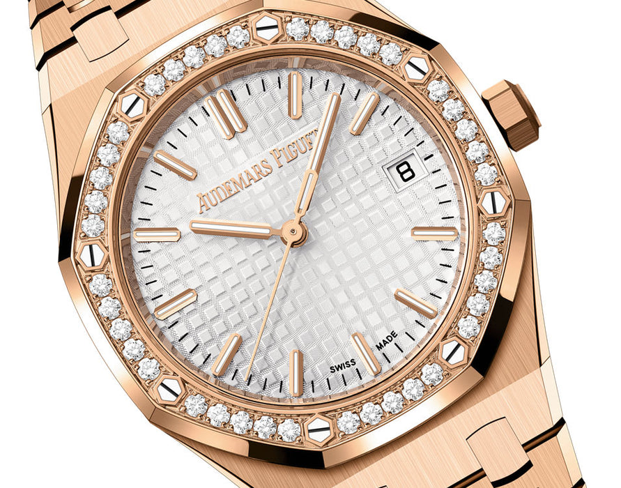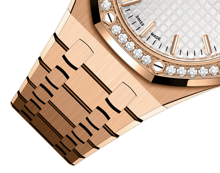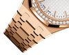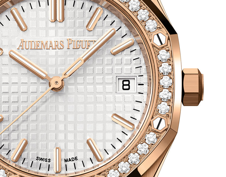 Dial: Silver-toned dial with “Grande Tapisserie” pattern, pink gold applied hour-markers and Royal Oak hands with luminescent coating.