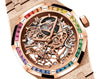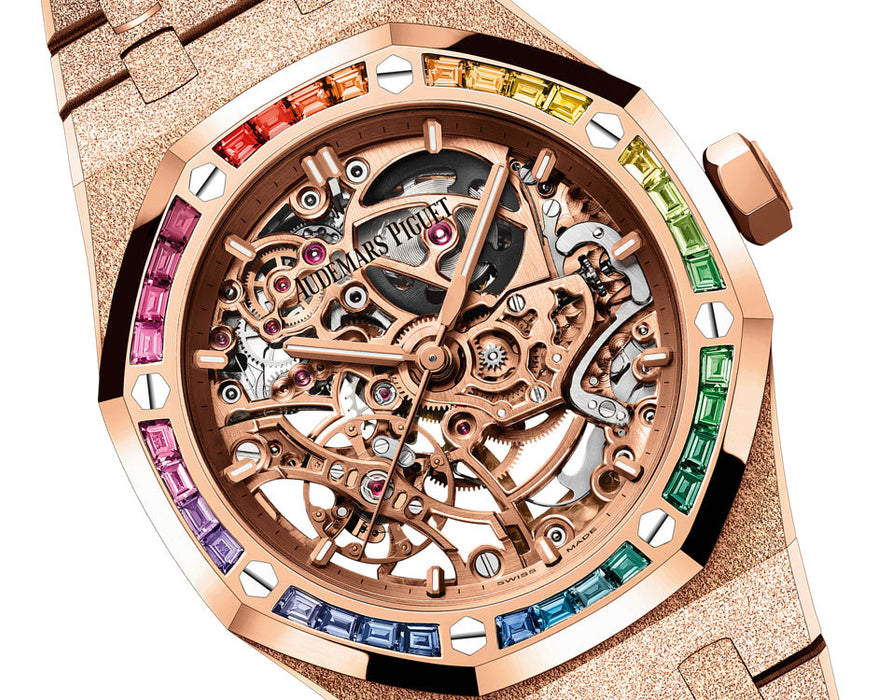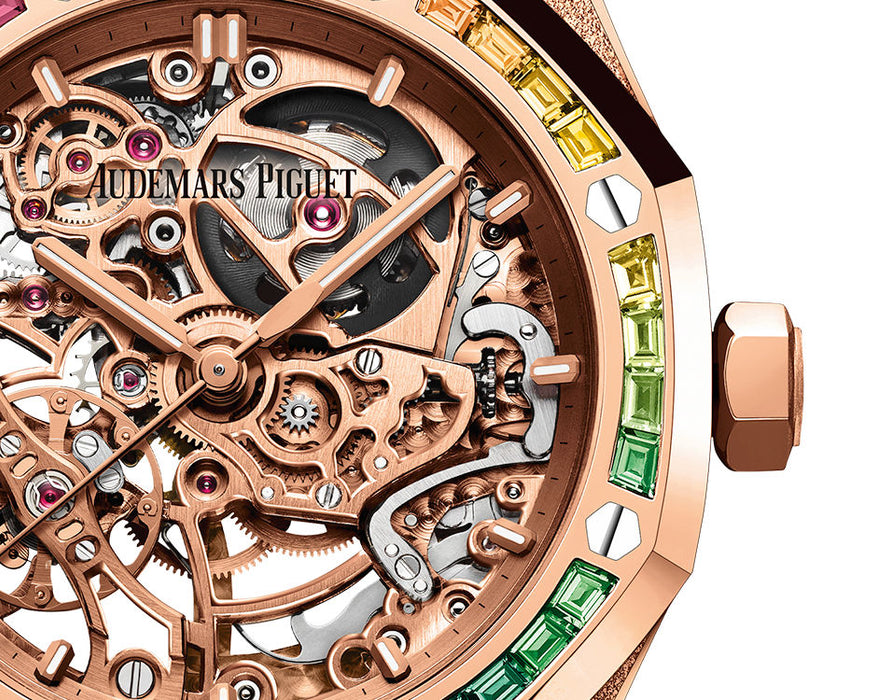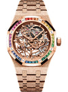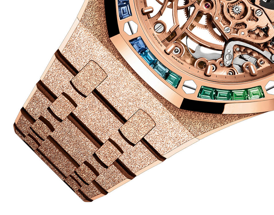 Dial: Pink gold-toned openworked dial, pink gold applied hour-markers and Royal Oak hands with luminescent coating