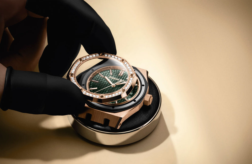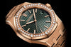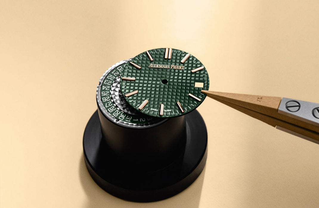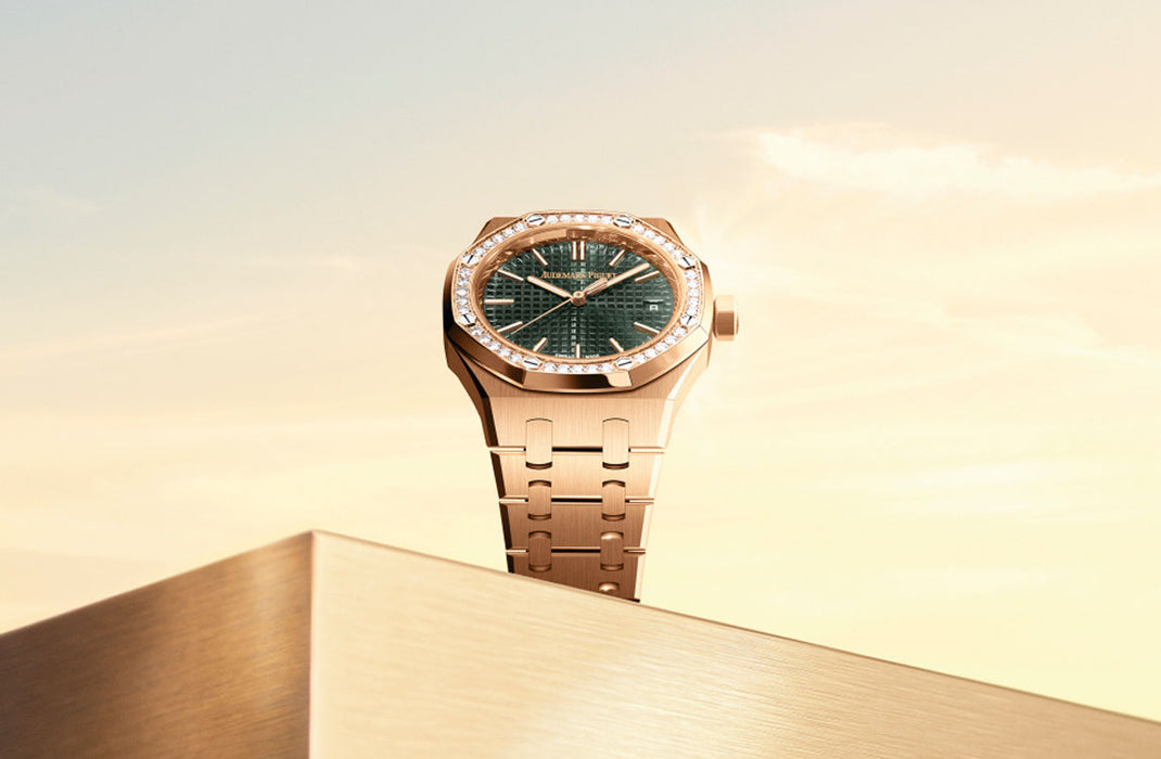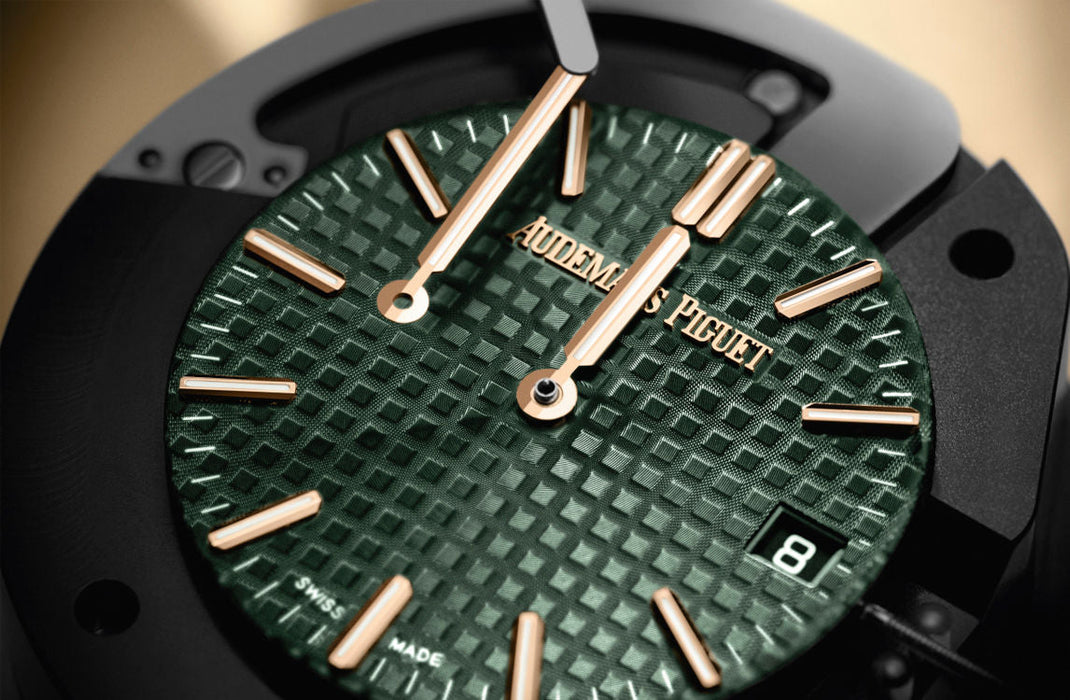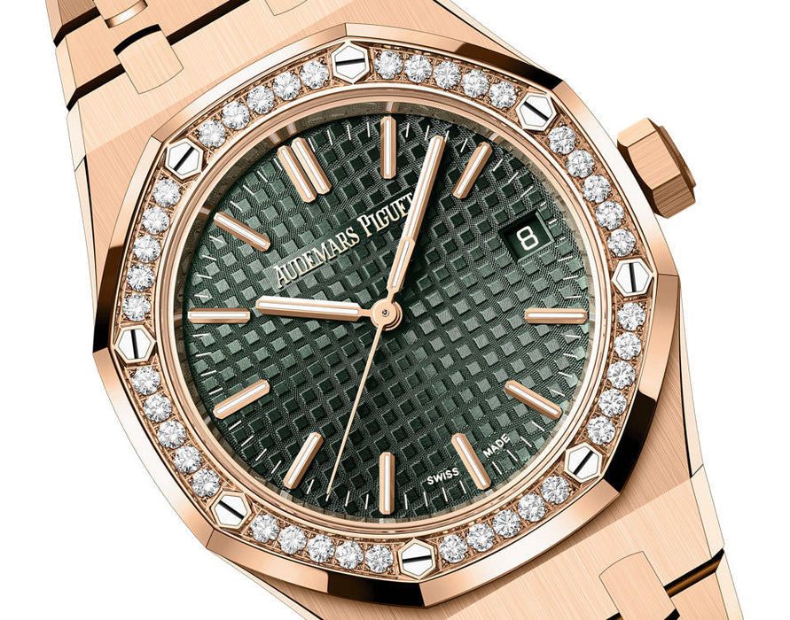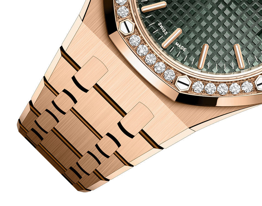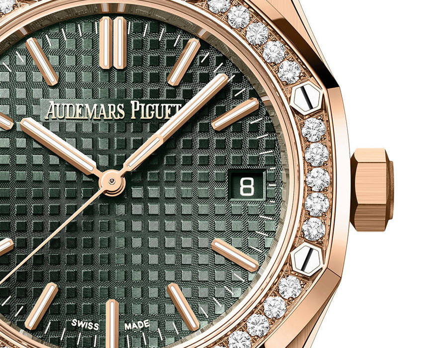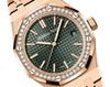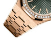 Dial: Khaki green dial with “Grande Tapisserie” pattern, pink gold applied hour-markers and Royal Oak hands with luminescent coating.
