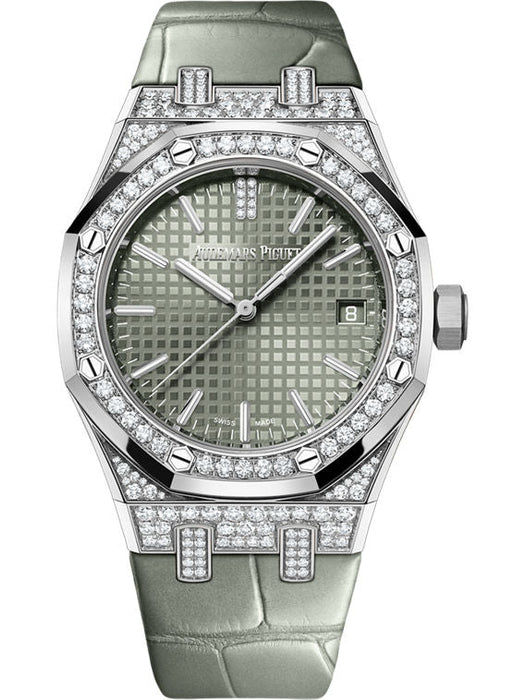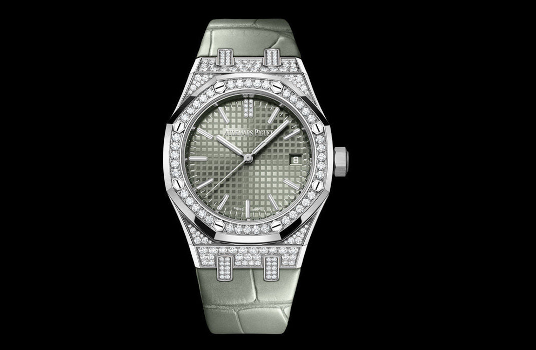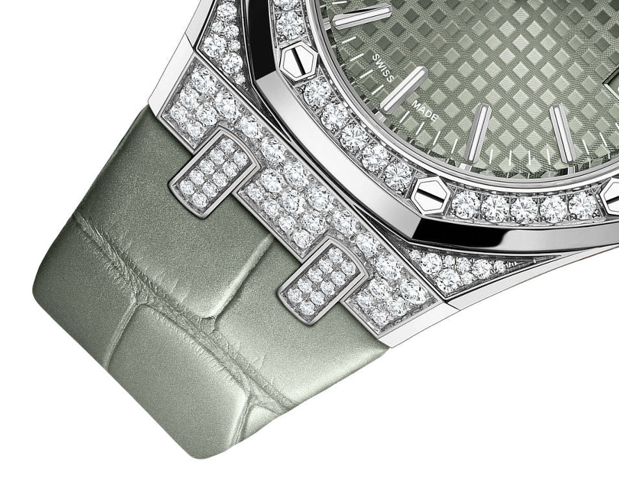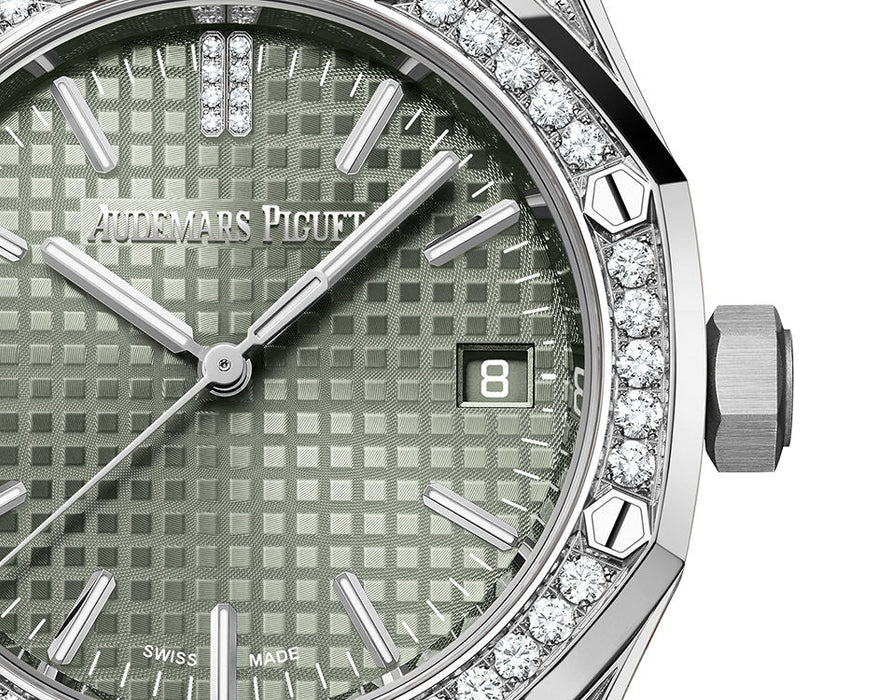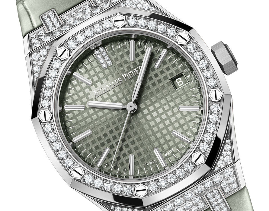 Dial: Green dial with “Grande Tapisserie” pattern, white gold applied hour-markers and Royal Oak hands with luminescent coating.