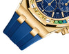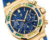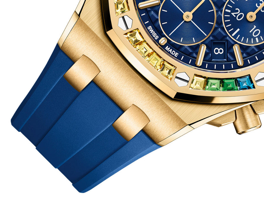 Bracelet: Blue rubber strap with 18K Yellow Gold AP folding clasp and interchangeable strap system. Additional green rubber strap.
