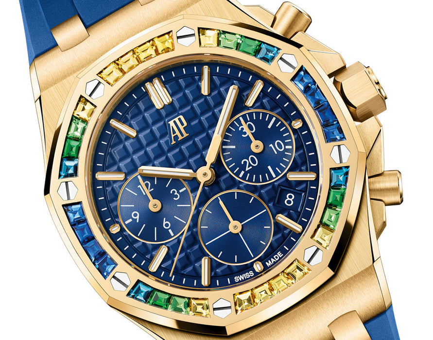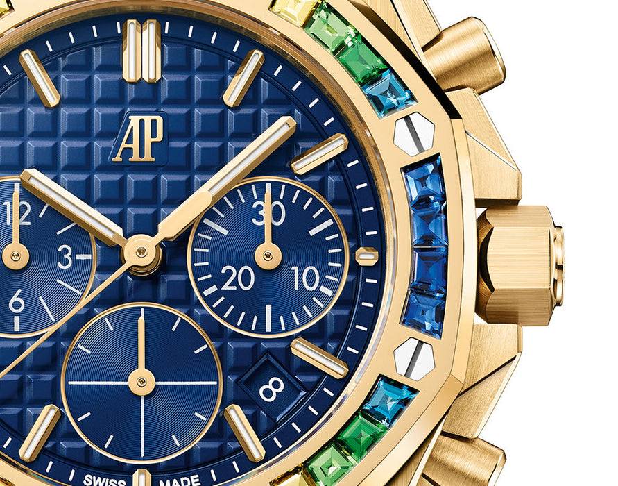 Dial: Blue dial with “Lady Tapisserie” pattern, blue counters, yellow gold applied hour-markers and Royal Oak hands with luminescent coating.