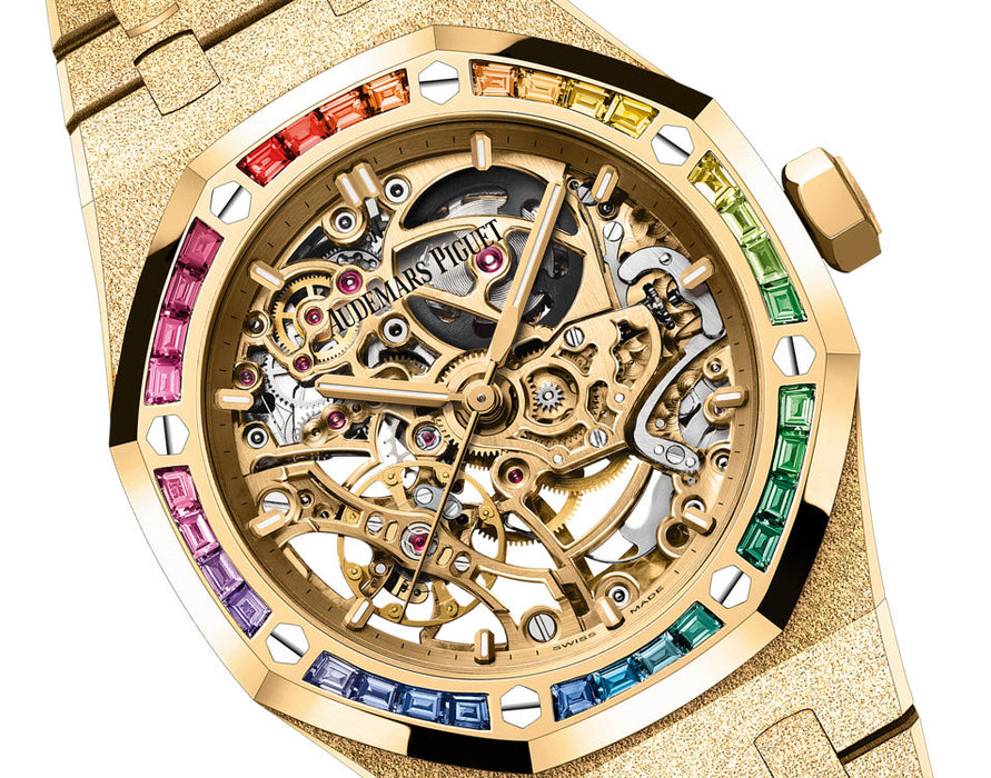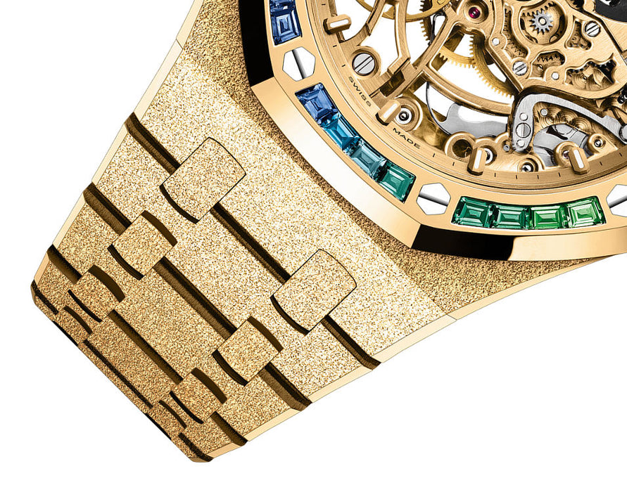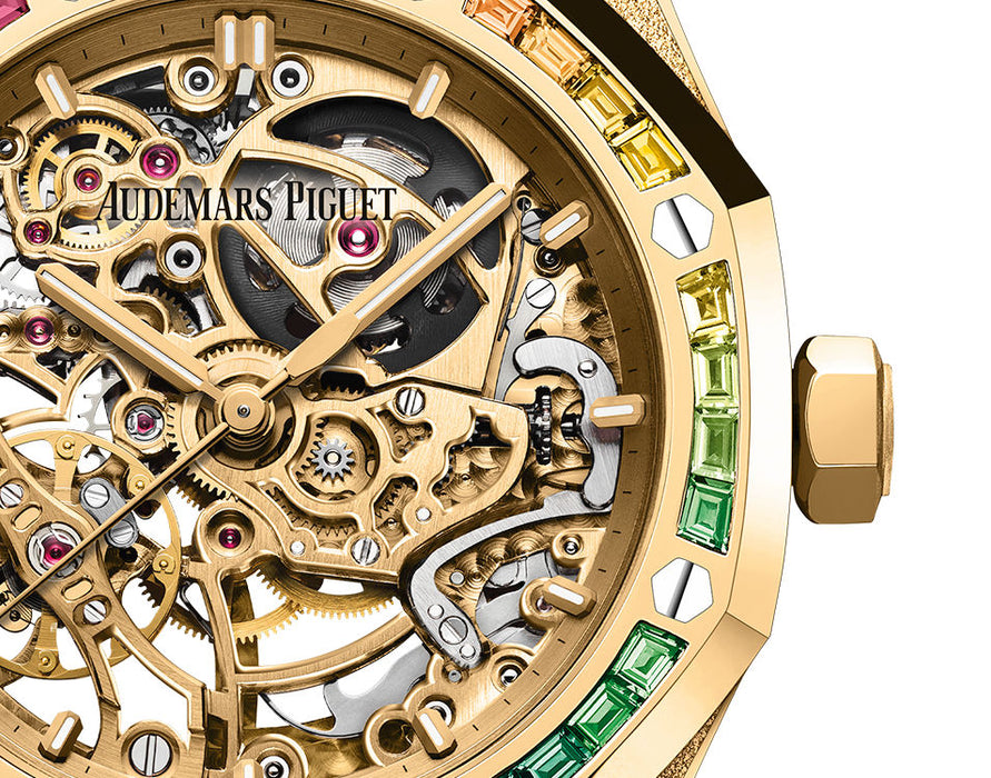 Dial: Yellow gold-toned openworked dial, yellow gold applied hour-markers and Royal Oak hands with luminescent coating