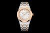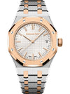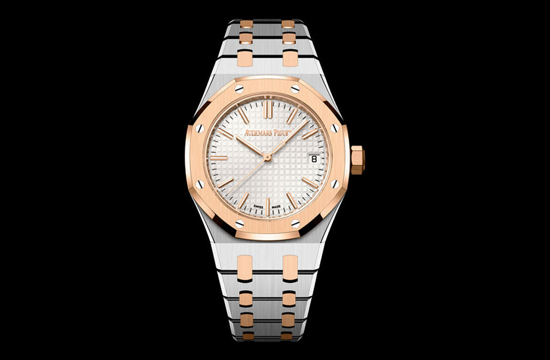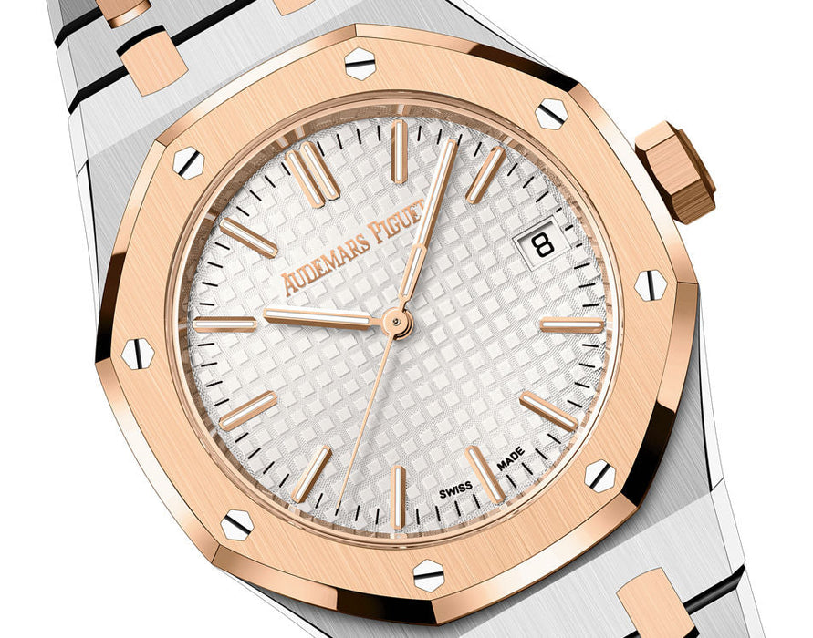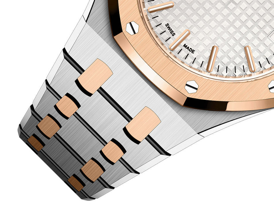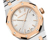 Dial: Silver-toned dial with “Grande Tapisserie” pattern, pink gold applied hour-markers and Royal Oak hands with luminescent coating.