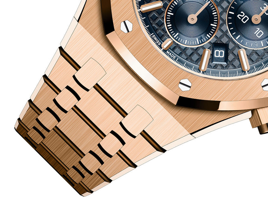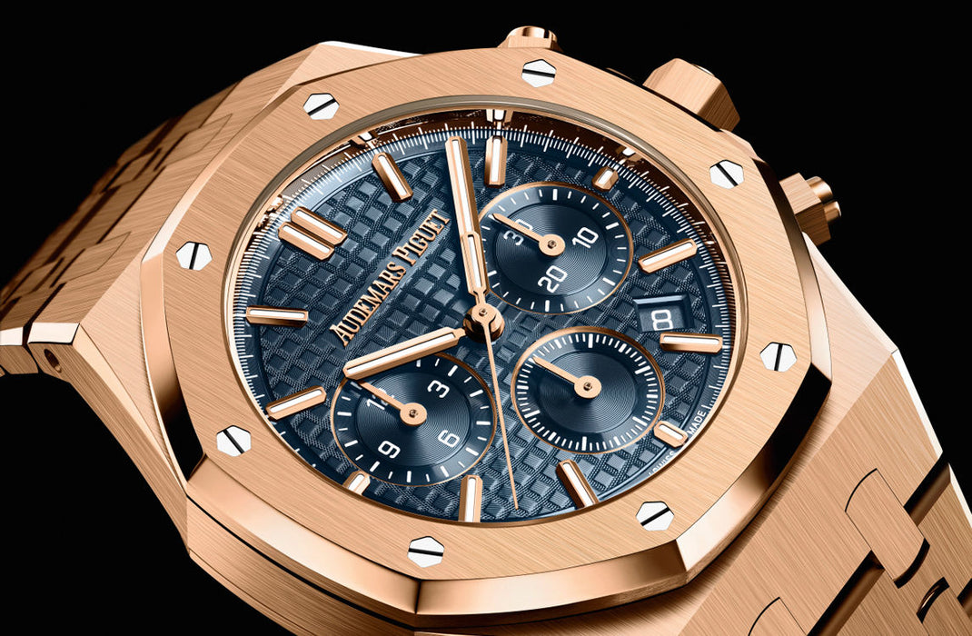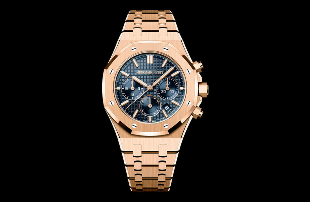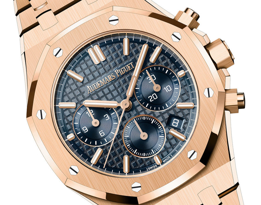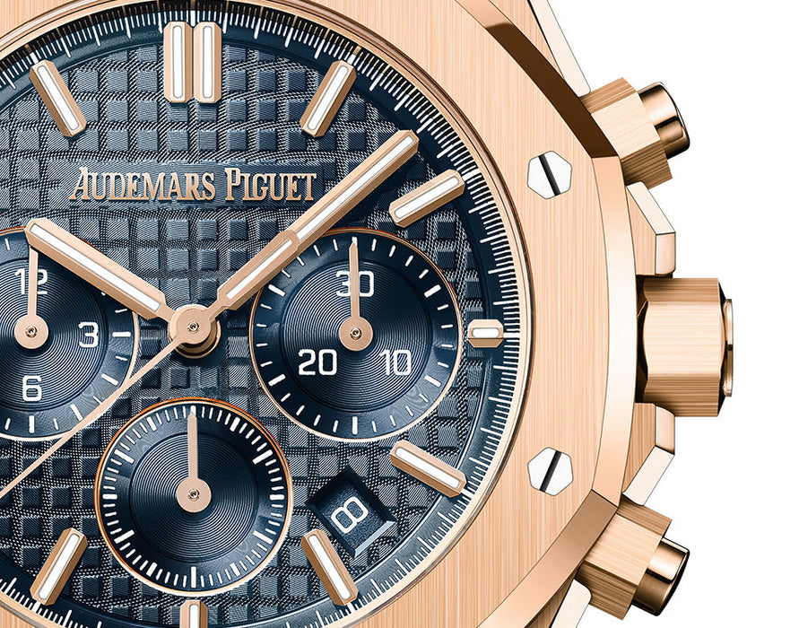 Dial: “Bleu nuit nuage 50” dial with “Grande Tapisserie” pattern, “Bleu nuit nuage 50” counters, pink gold applied hour-markers and Royal Oak hands with luminescent coating.