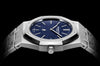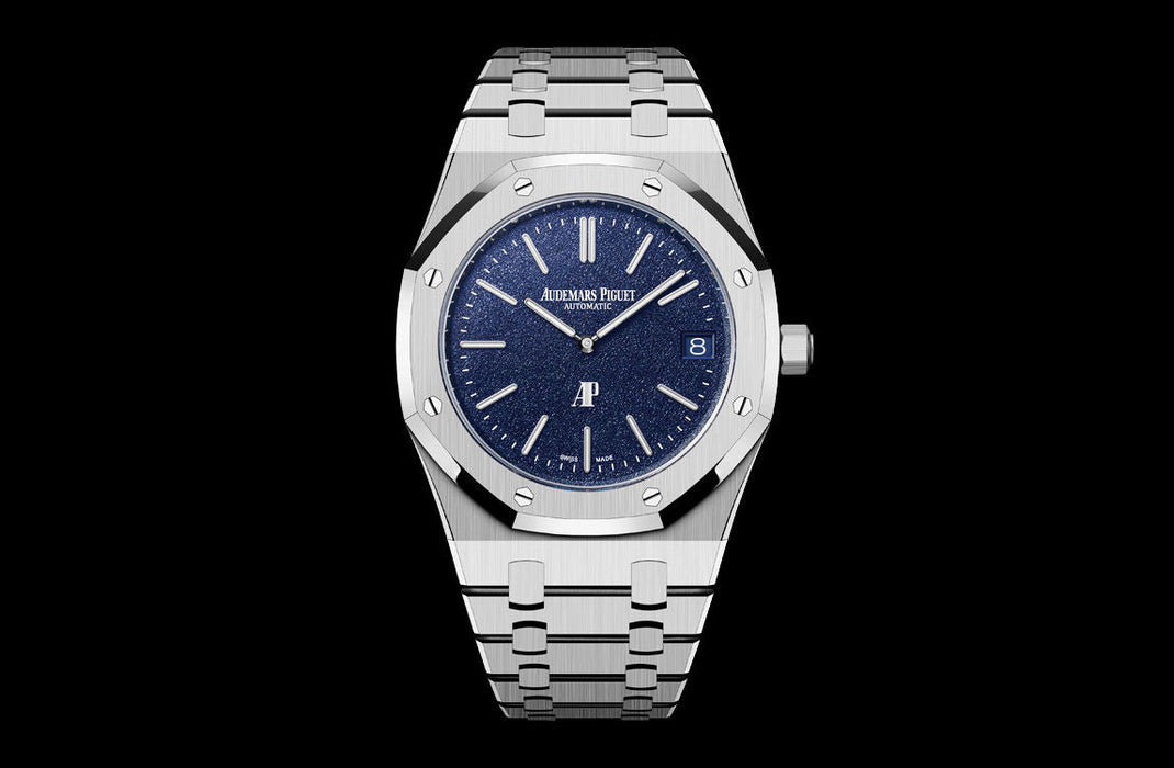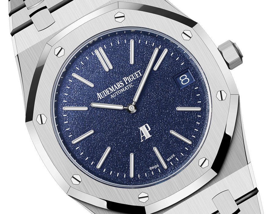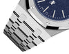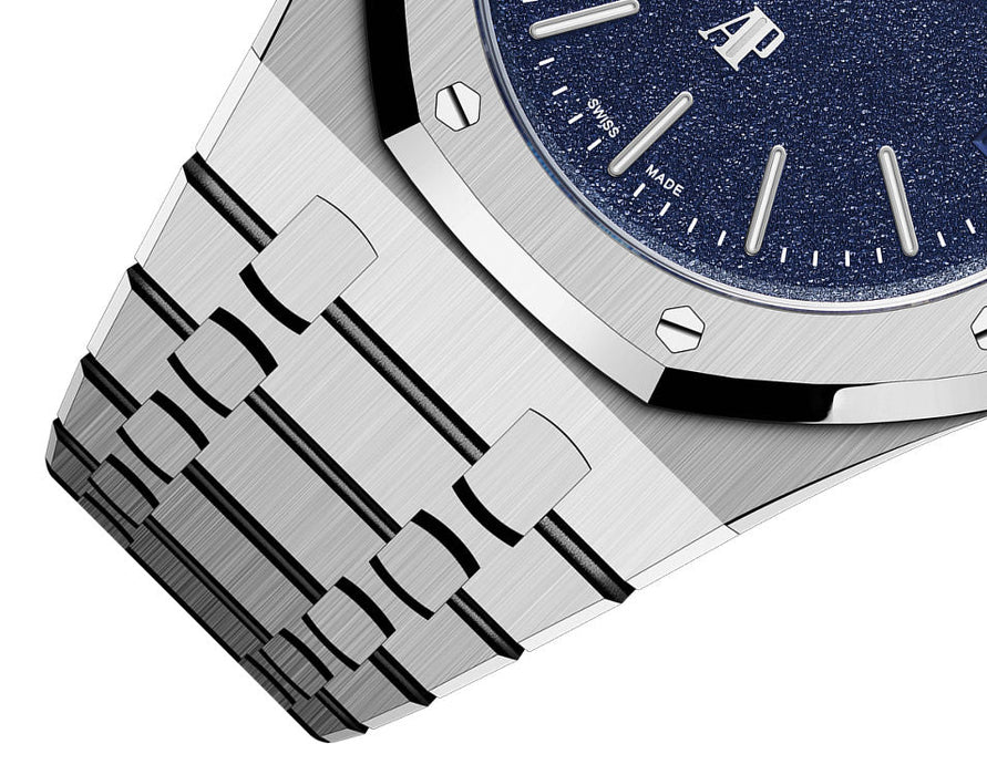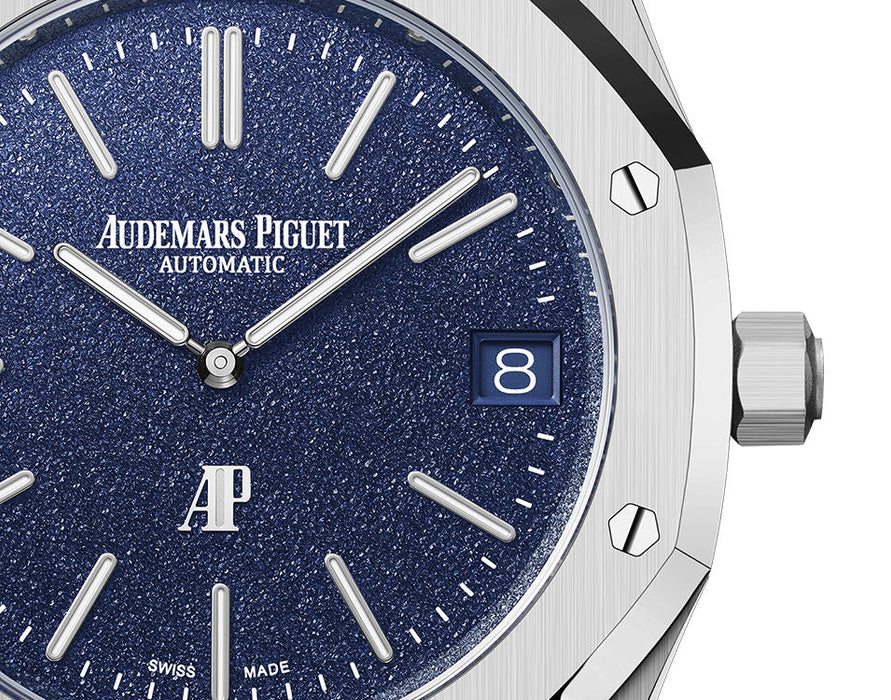 Dial: Blue dial with “grainy effect”, white gold applied hour-markers and Royal Oak hands with luminescent coating.