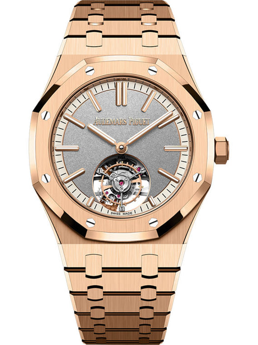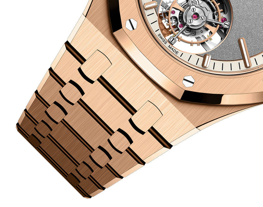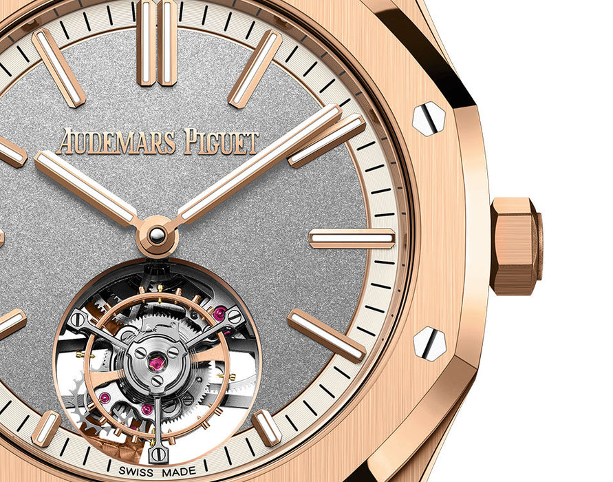 Dial: Sandblasted grey dial with snailed ivory external zone, pink gold applied hour-markers and Royal Oak hands with luminescent coating.