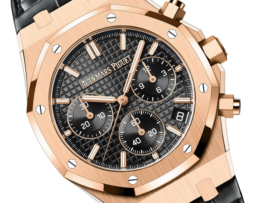 Bracelet: Black alligator strap with 18K Rose Gold AP folding clasp.