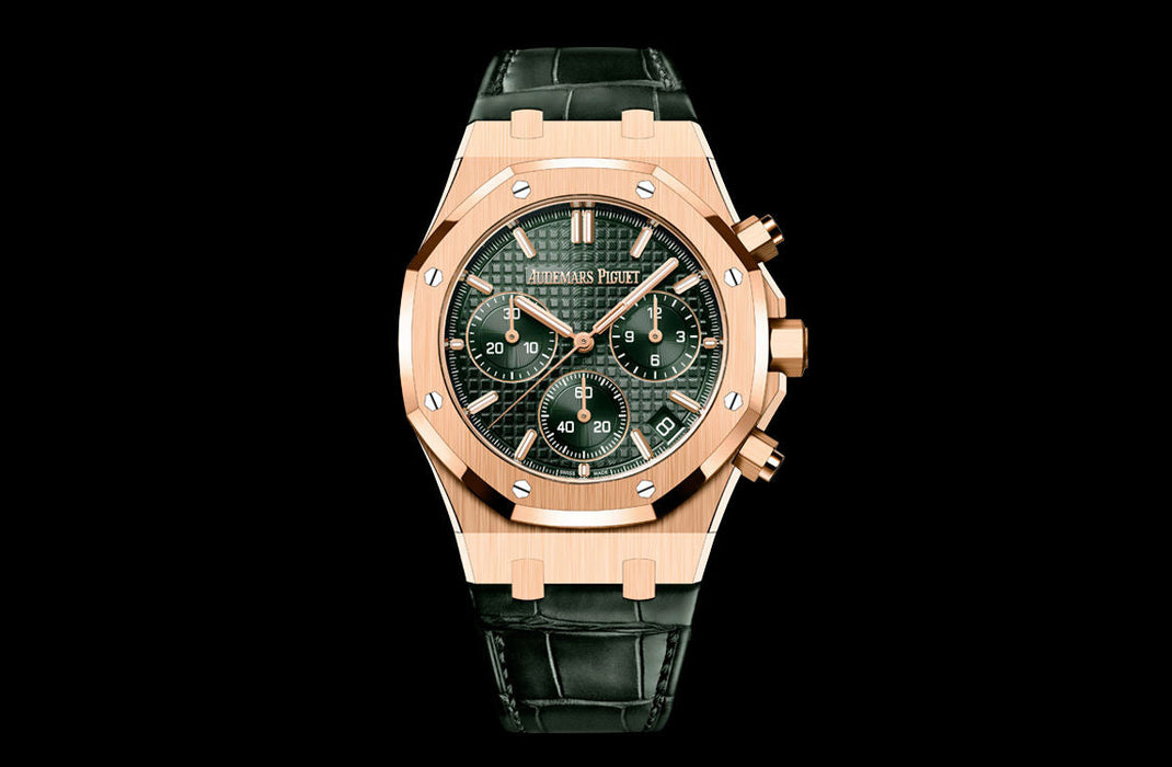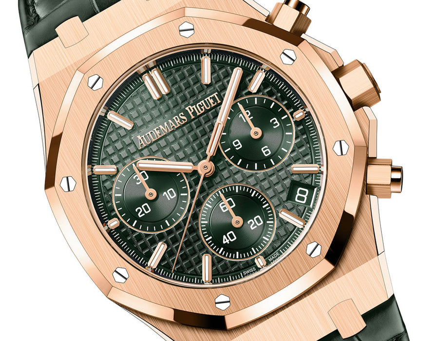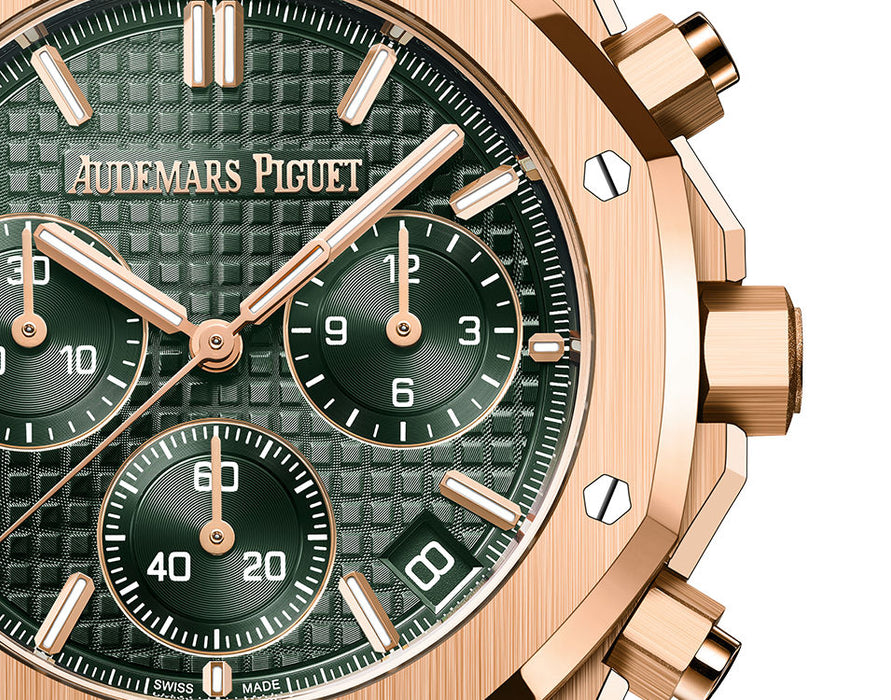 Dial: Khaki green dial with “Grande Tapisserie” pattern, green counters, pink gold applied hour-markers and Royal Oak hands with luminescent coating.