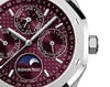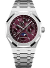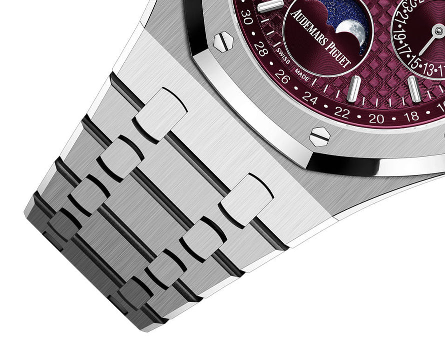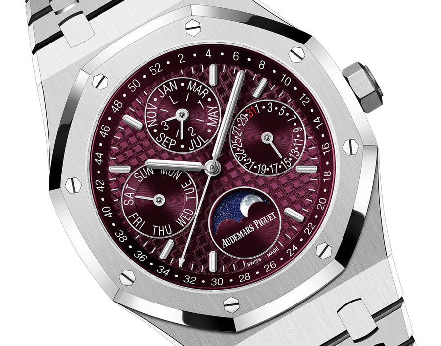 Dial: Burgundy dial with “Grande Tapisserie” pattern, burgundy counters, white gold applied hour-markers and Royal Oak hands with luminescent coating, burgundy inner bezel.