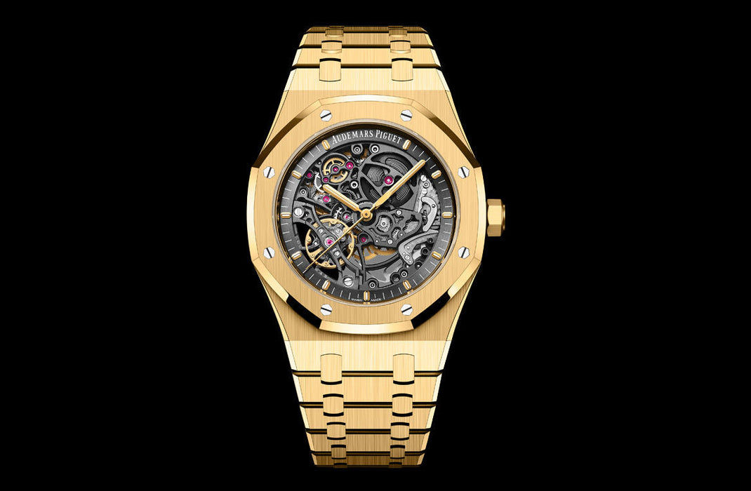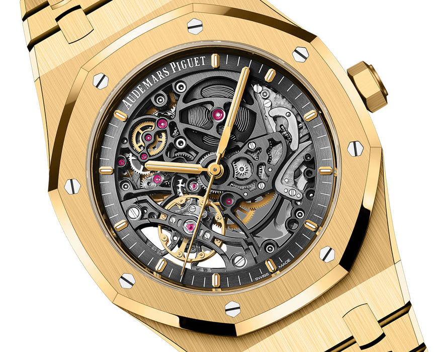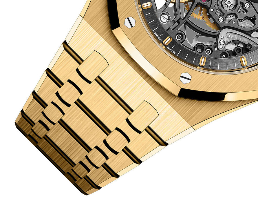 Dial: Blackened inner bezel, yellow gold applied hour-markers and Royal Oak hands with luminescent coating.