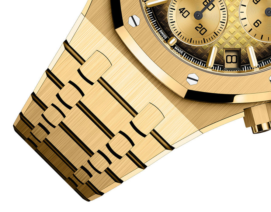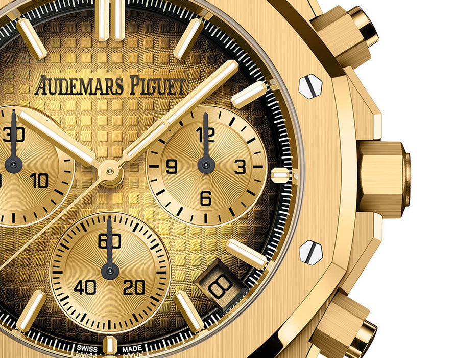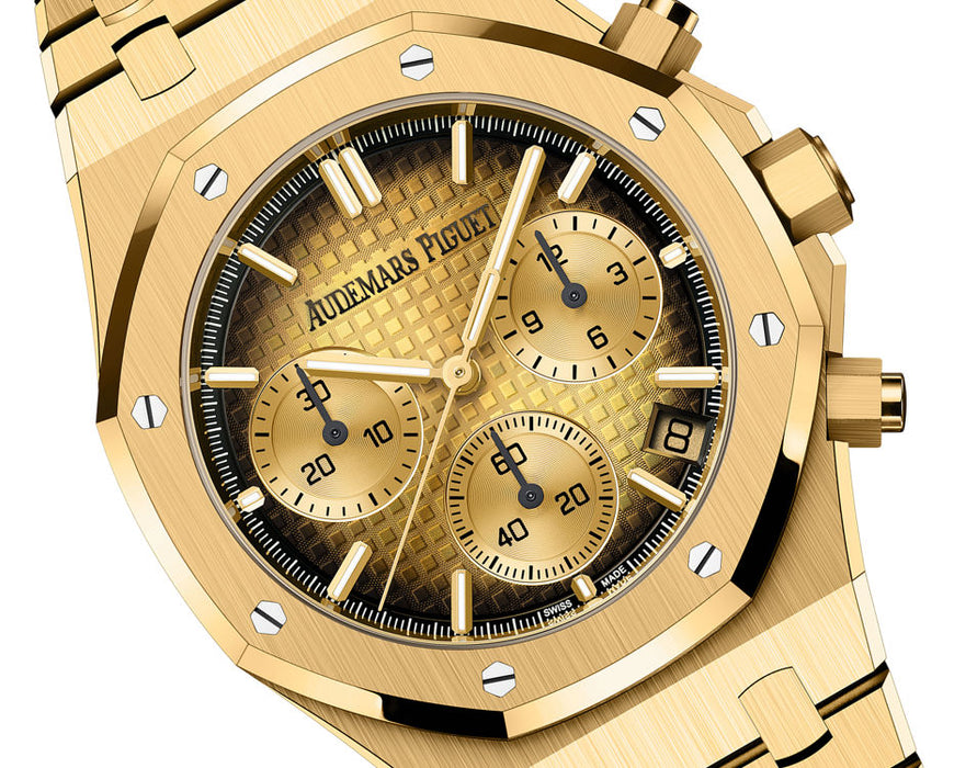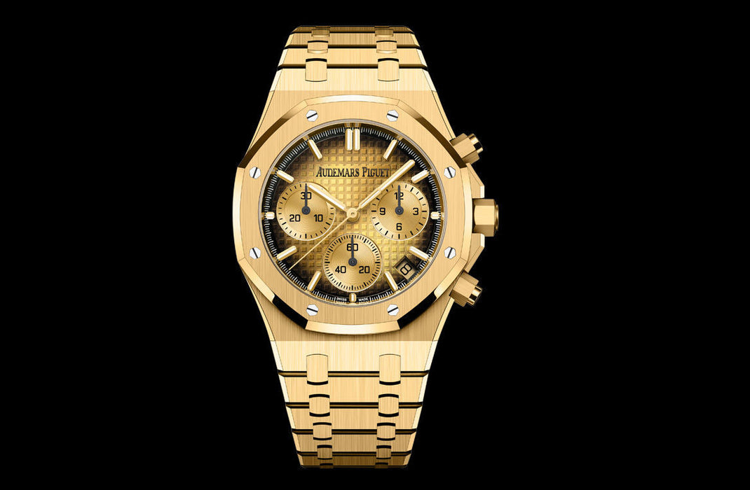 Dial: Smoked yellow gold-toned dial with “Grande Tapisserie” pattern, yellow gold applied hour-markers and Royal Oak hands with luminescent coating.