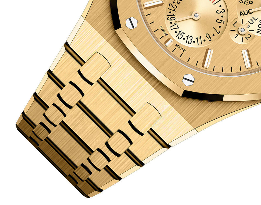 Dial: Yellow gold-toned dial and counters, yellow gold hour-markers and Royal Oak hands with luminescent coating.