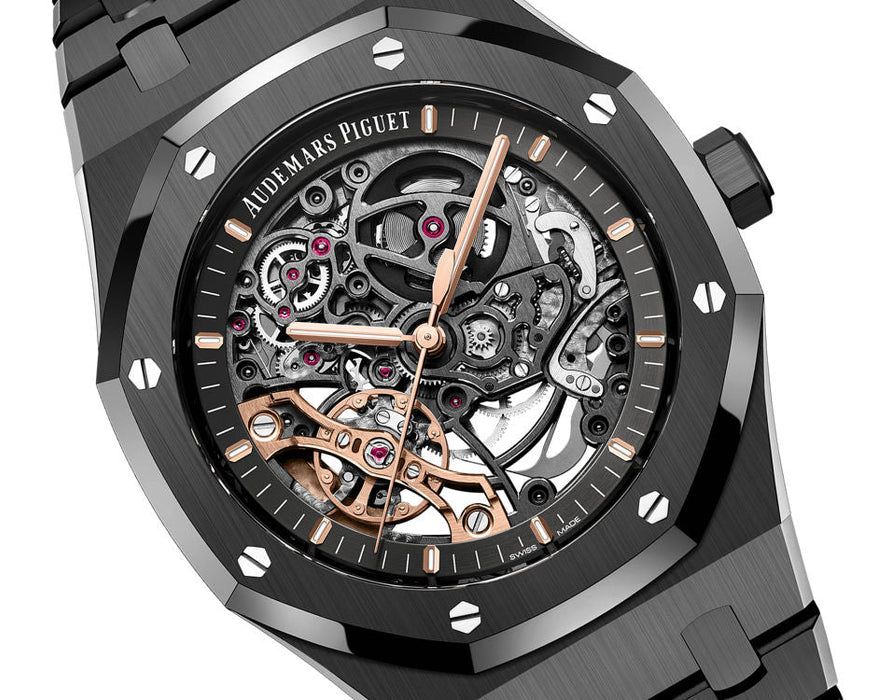 Dial: Openworked slate grey dial, pink gold applied hour-markers and Royal Oak hands with luminescent coating.