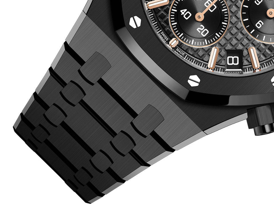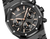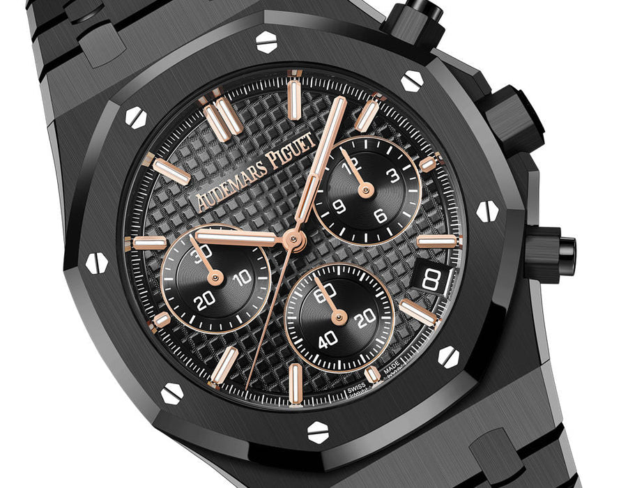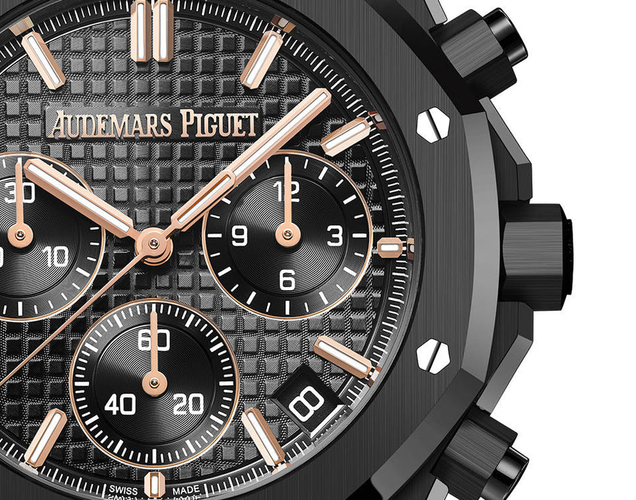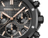 Dial: Black dial with “Grande Tapisserie” pattern, black counters, pink gold applied hour-markers and Royal Oak hands with luminescent coating.