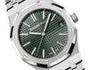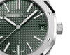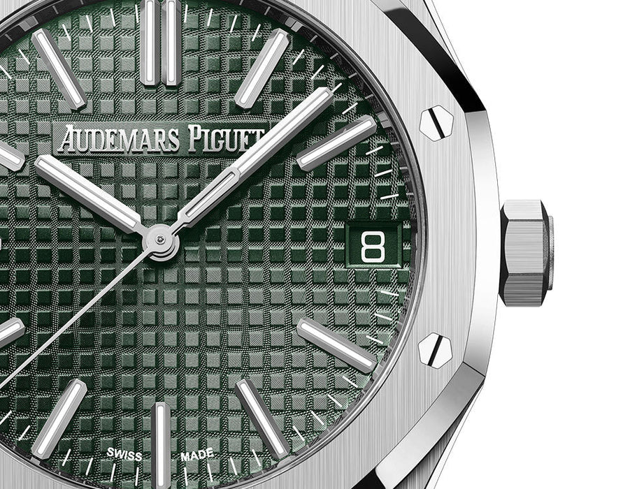 Dial: Khaki green dial with “Grande Tapisserie” pattern, white gold applied hour-markers and Royal Oak hands with luminescent coating.
