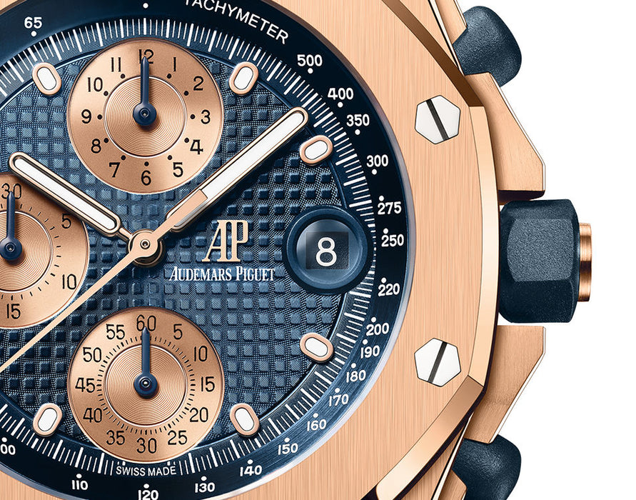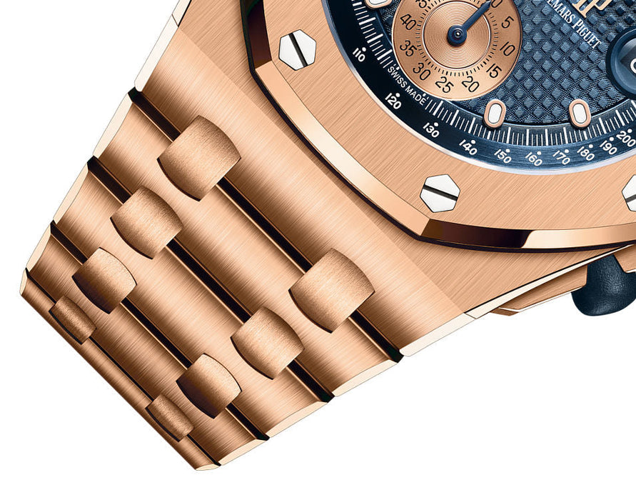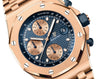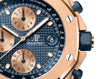 Dial: Blue dial with “Petite Tapisserie” pattern, pink gold-toned counters, pink gold applied hour-markers and Royal Oak hands with luminescent coating, blue inner bezel.