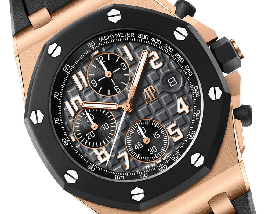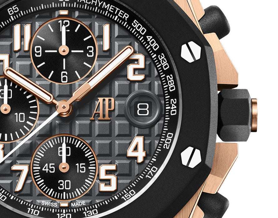 Bracelet: Black rubber strap with 18K Rose Gold AP pin buckle and interchangeable strap system. Additional black calfskin strap.