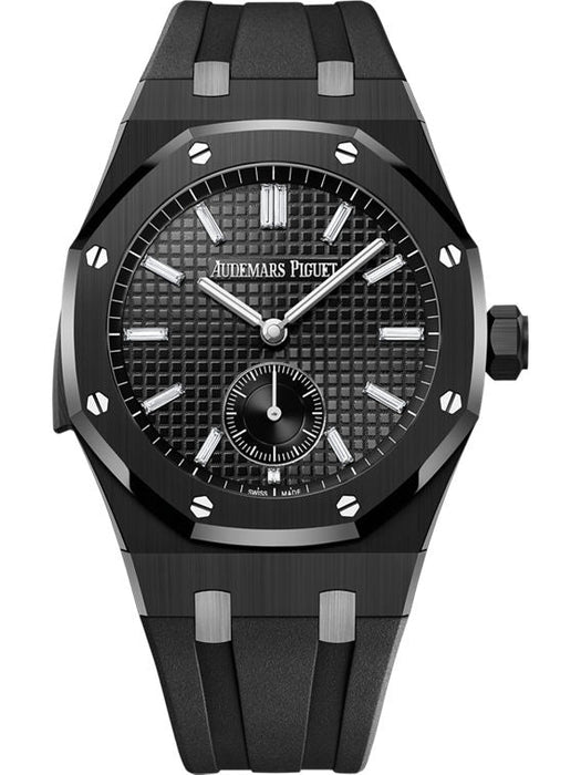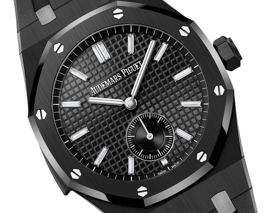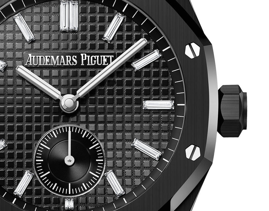 Dial: Black dial with “Grande Tapisserie” pattern, 13 baguette-cut diamond hour-markers and white gold Royal Oak hands with luminescent coating.