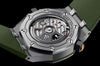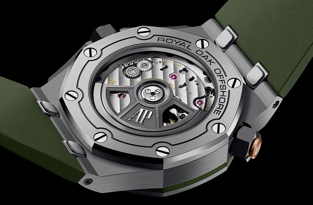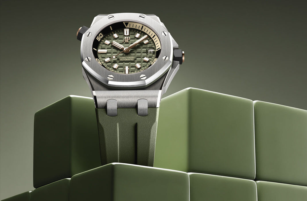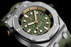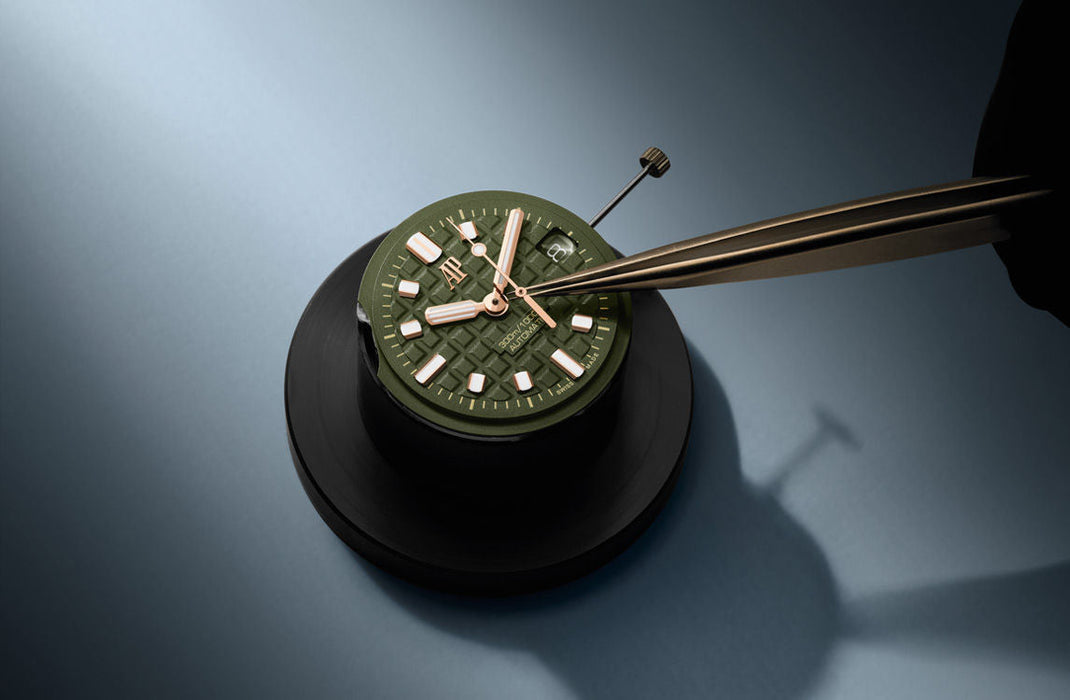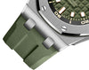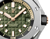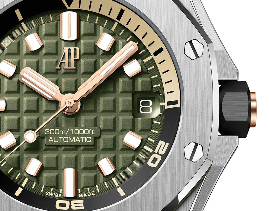 Dial: Khaki green dial with “Méga Tapisserie” pattern, pink gold applied hour-markers and Royal Oak hands with luminescent coating, black rotating inner bezel with zone from 60 to 15 minutes in beige