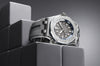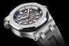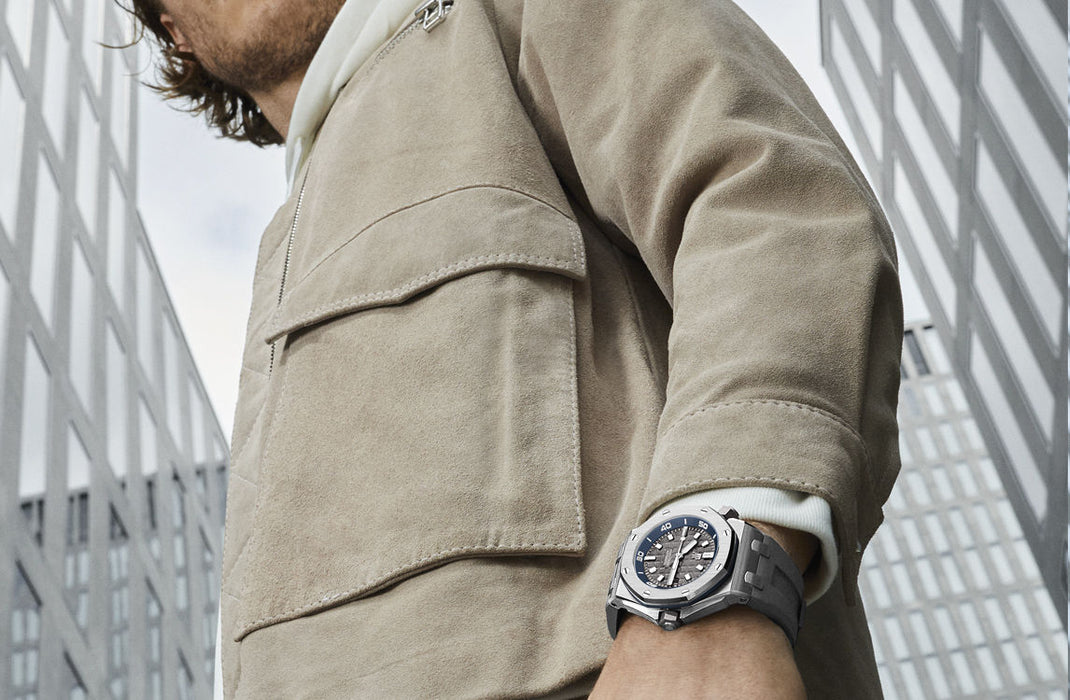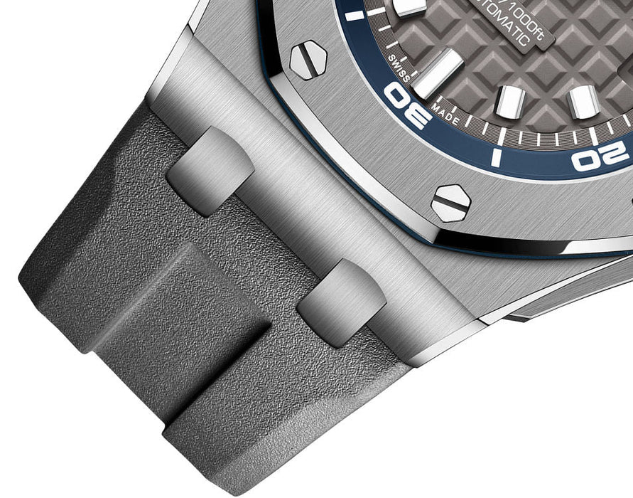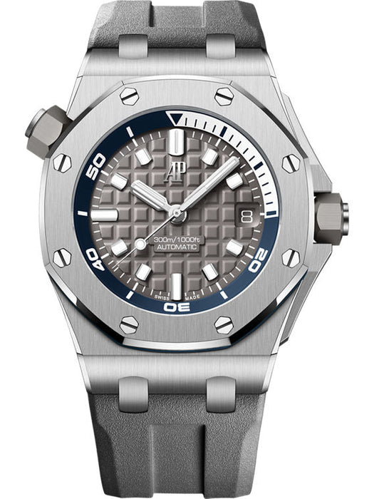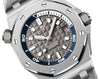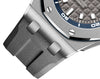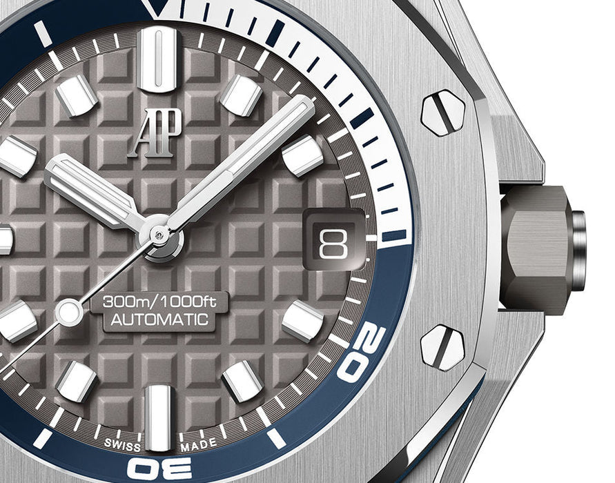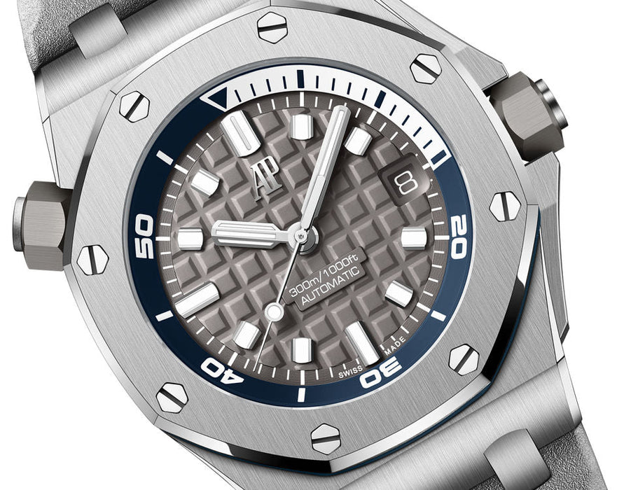 Dial: Grey dial with “Méga Tapisserie” pattern, white gold applied hour-markers and Royal Oak hands with luminescent coating, blue rotating inner bezel with zone from 60 to 15 minutes in white