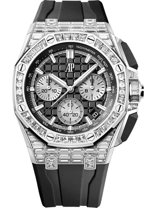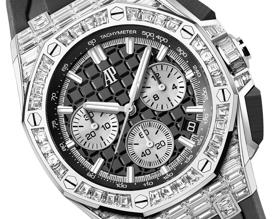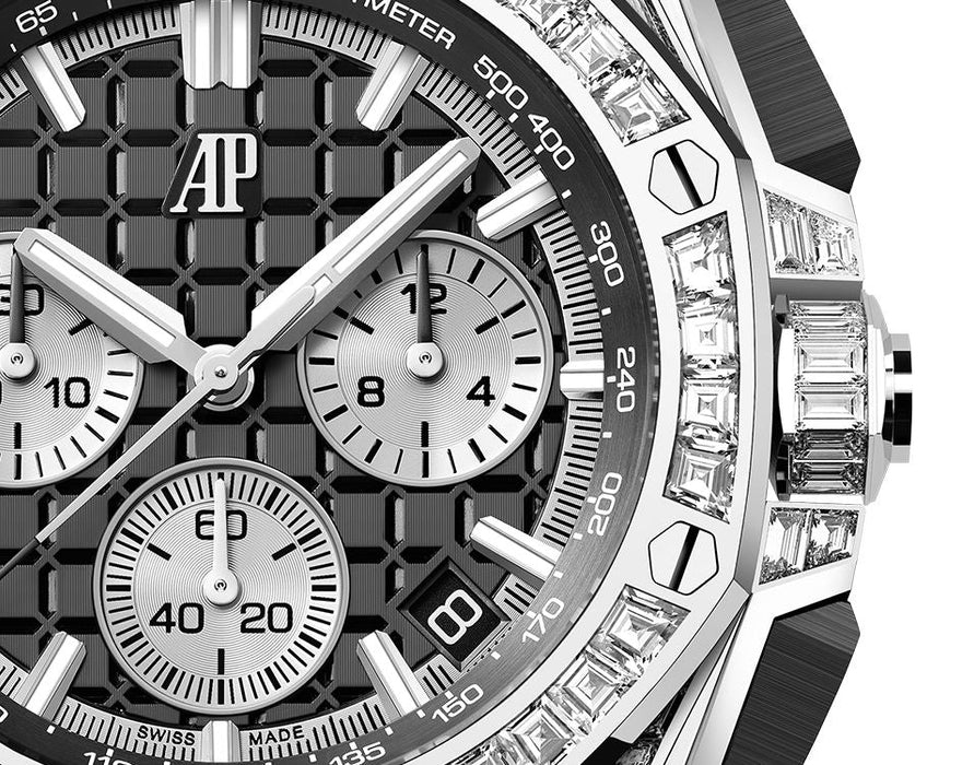 Dial: Black dial with “Méga Tapisserie” pattern, silver-toned counters, white gold applied hour-markers and Royal Oak hands with luminescent coating, black inner bezel.