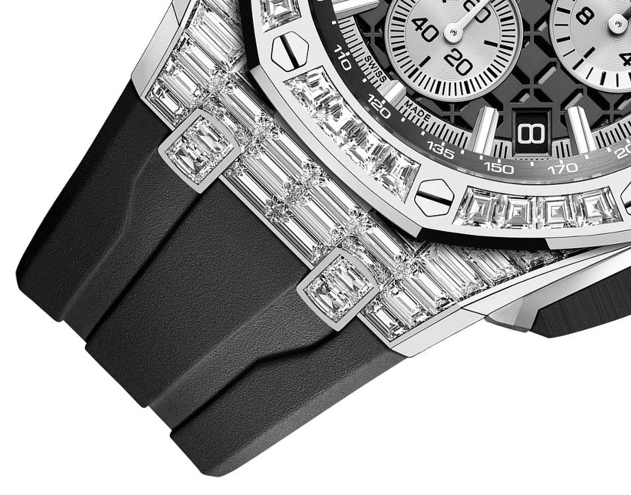Bezel: 80 baguette-cut diamonds; ~8.2 carats (case). 32 baguette-cut diamonds; ~1.4 carats (bezel). 12 baguette-cut diamonds; ~1.2 carats (buckle).