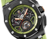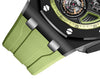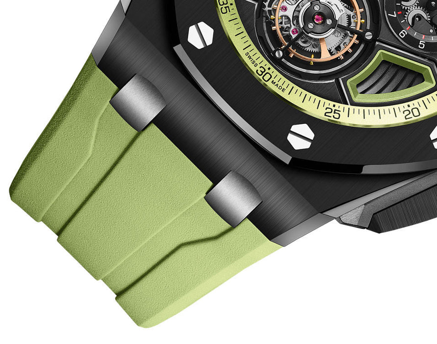 Bracelet: Green rubber strap with titanium AP folding clasp and interchangeable strap system. Additional black rubber strap.