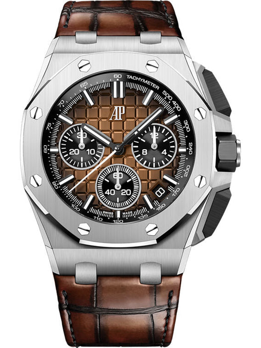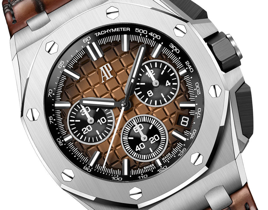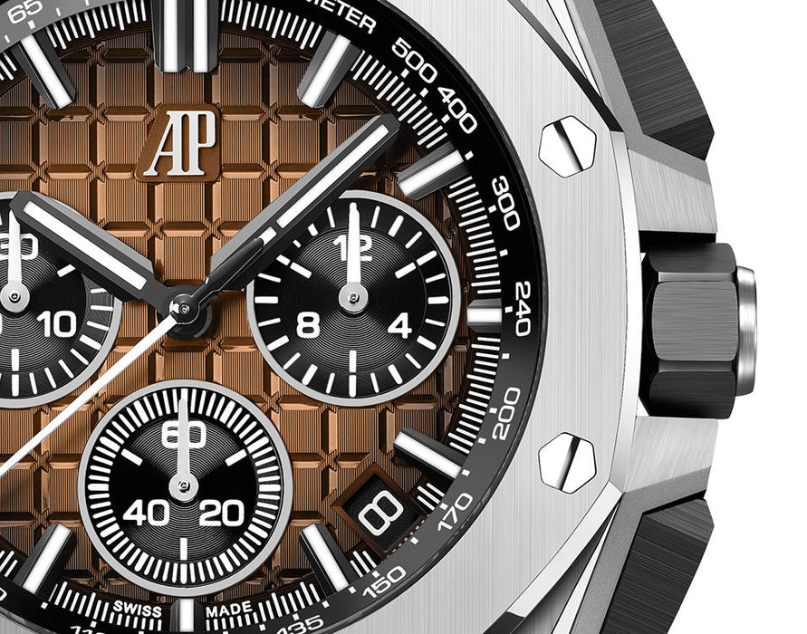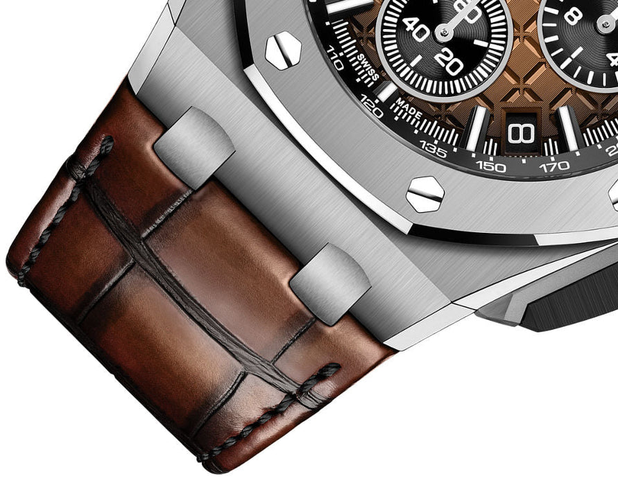 Dial: Smoked bronze dial with “Méga Tapisserie” pattern, black counters, white gold applied hour-markers with black coating and Royal Oak hands with luminescent coating.