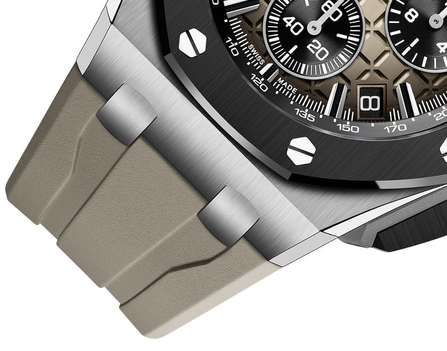 Dial: Smoked light brown dial with “Méga Tapisserie” pattern, black counters and external zone, white gold applied hour-markers, white gold Royal Oak hands with luminescent coating, black inner bezel