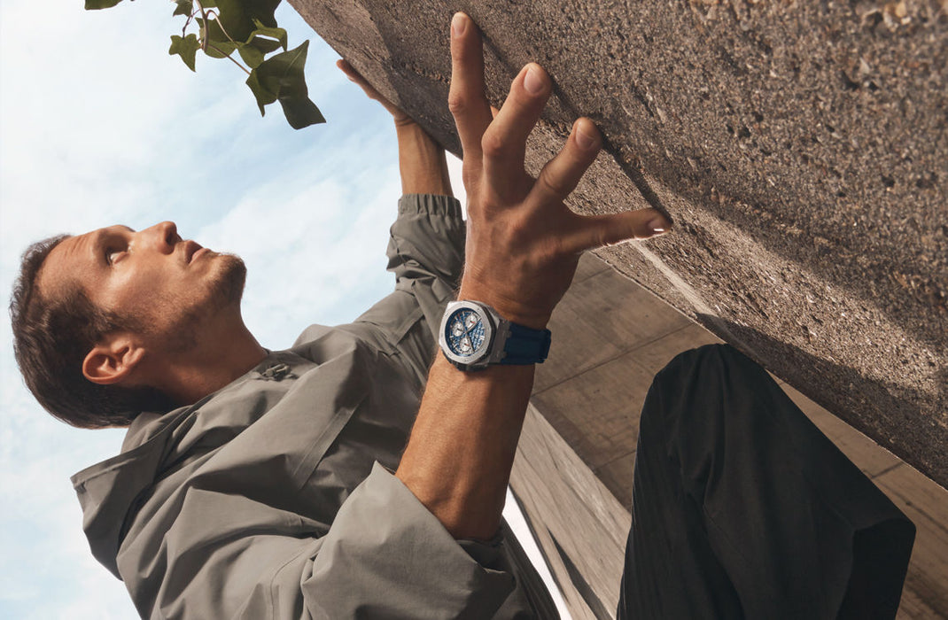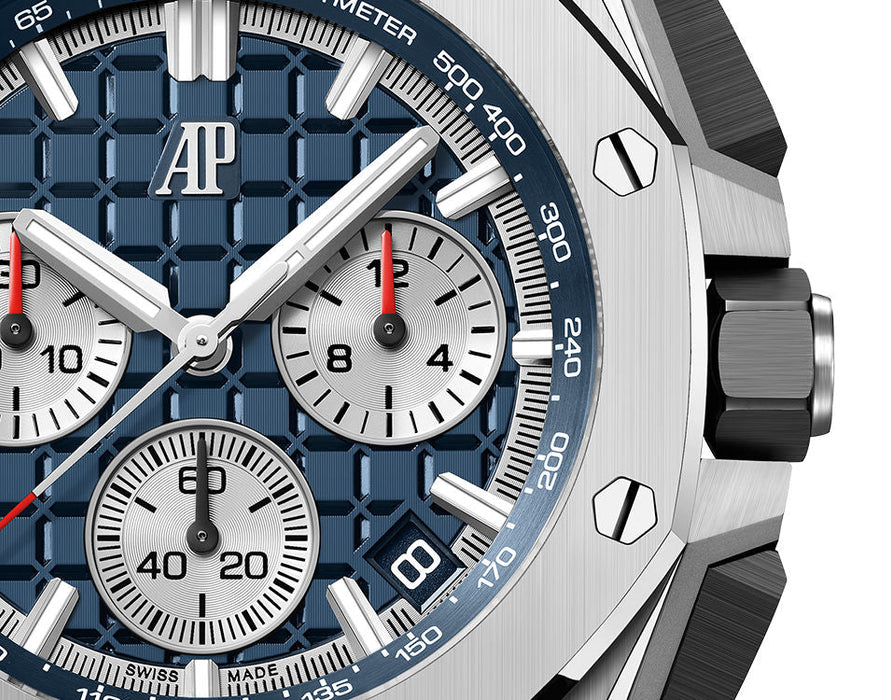 Dial: Blue dial with “Méga Tapisserie” pattern, rhodium-toned counters and external zone, white gold applied hour-markers and Royal Oak hands with luminescent coating, blue inner bezel