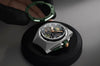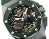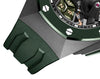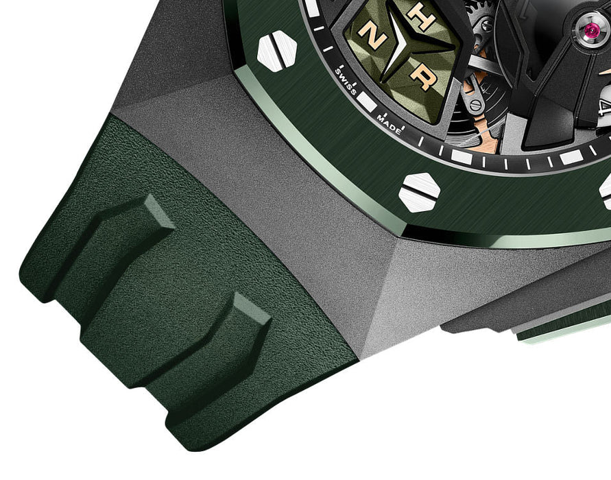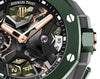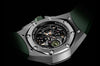 Bracelet: Textured green rubber strap with sandblasted titanium AP folding clasp. Additional black rubber strap.