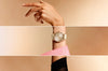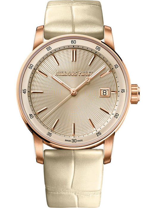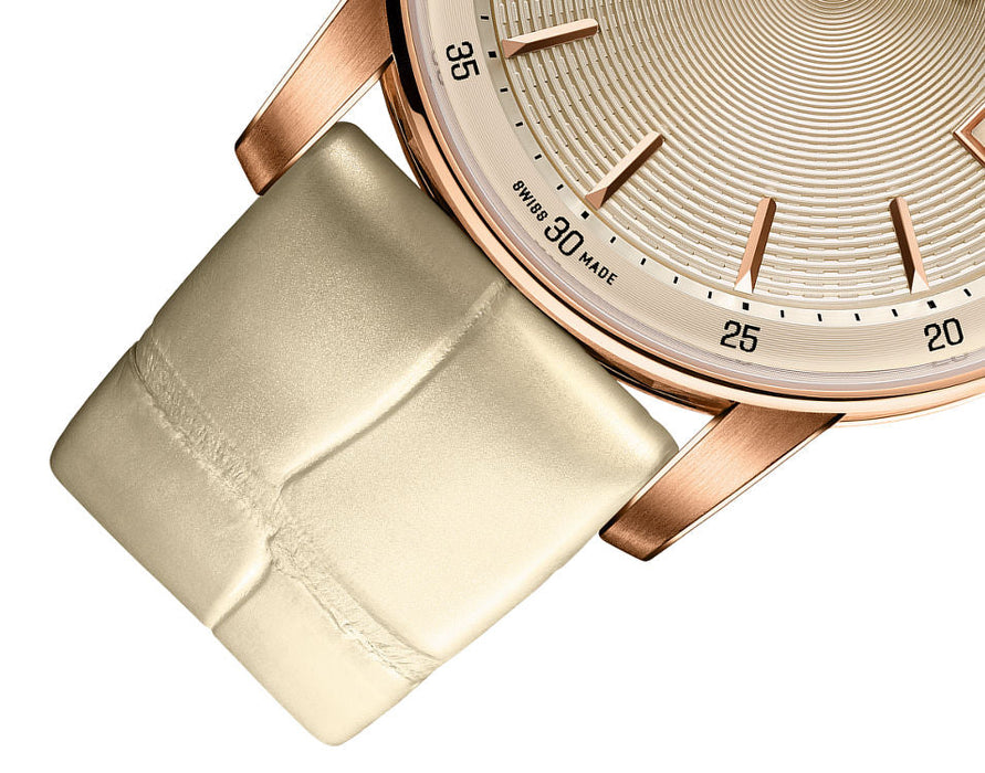 Bracelet: Pearly beige “large square scale” alligator strap with 18K Rose Gold pin buckle.