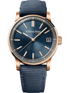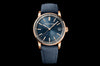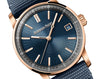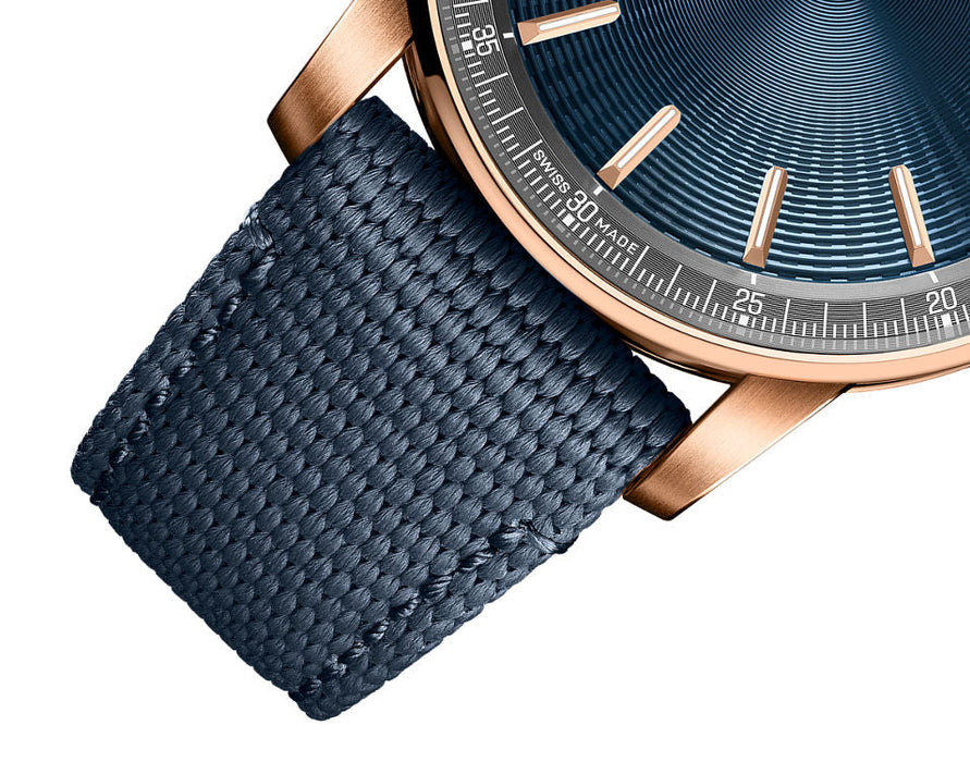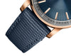 Bracelet: Blue rubber-coated strap with 18K Rose Gold pin buckle.
