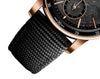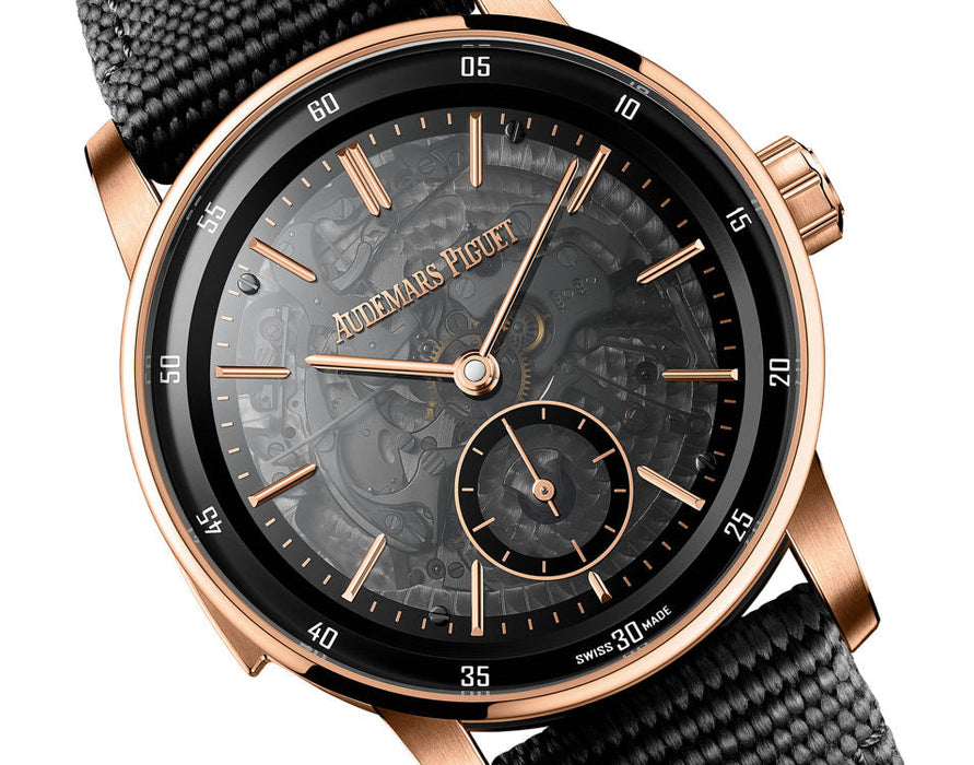 Bracelet: Black rubber-coated strap, 18K Rose Gold AP folding clasp.