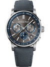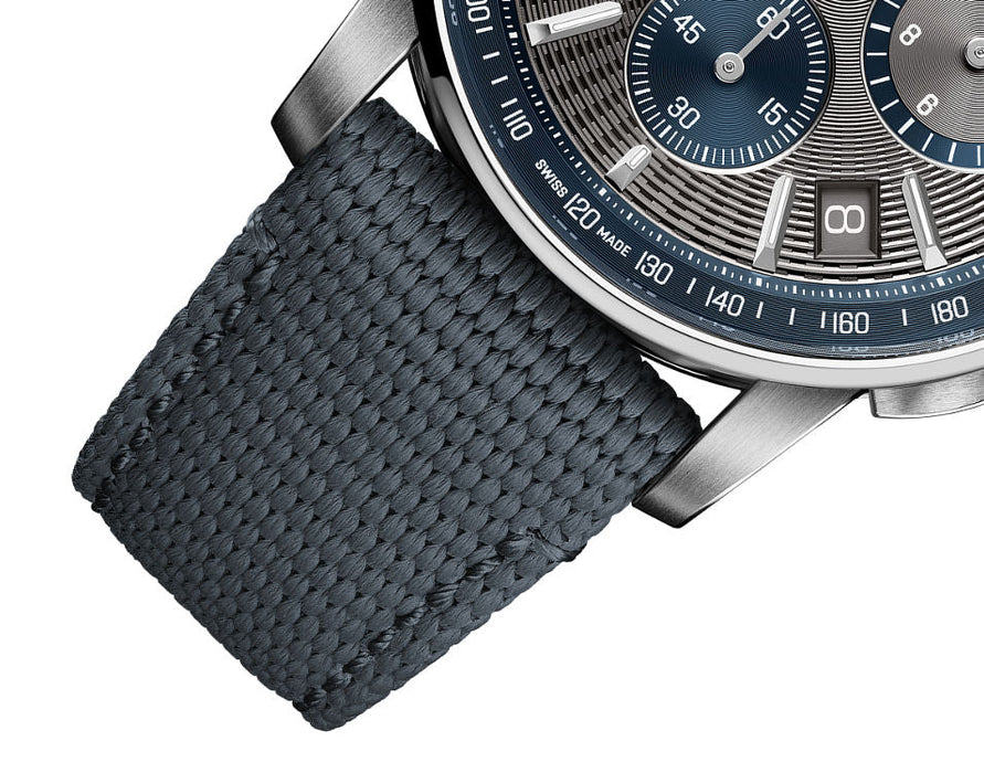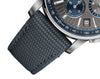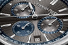 Dial: The grey embossed dial is paired with 18K White Gold luminescent hour-markers and hands, while the inner bezel and the external zones of the counters are executed in blue.